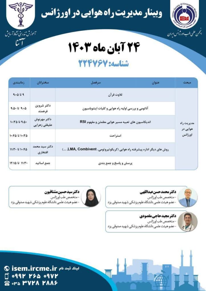 وبینار مدیریت راه هوایی در اورژانس تاریخ انتشار ۲۸ مهر ۱۴۰۴ دسته بندی دستهبندی نشده پاور ۱ پاور ۲ پاور ۳